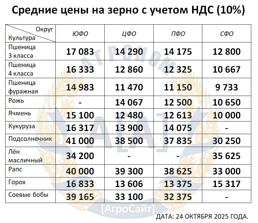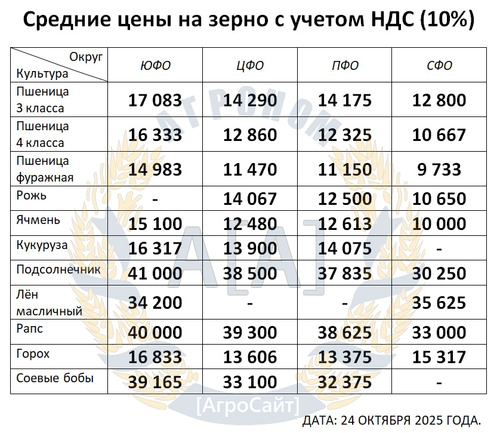 Индикативные цены текущего расчета ставок экспортных пошлин: у пшеницы 225,5$/t (0), ячменя 191,3$/t (-2,3) и кукурузы 208,6$/t (-7,1). Пошлины будут 29 октября – 4 ноября 2025г. за тонну: - для пшеницы 167,7 руб. (+68,6); - для ячменя 0 руб. (0); - для кукурузы 0 руб. (0) В Европейской России в основном превалировало снижение цен, а в Азиатской части наблюдался восстановительный отскок. Вместе с тем, вполне реально ожидать перемен в трендах с просадкой в Сибири при текущем снижении цен на пшеницу 3 класса в соседнем Казахстане на 1000 тенге до 85-89 тыс. тенге за тонну или 12 475–13 065 руб./т. по курсу ЦБ РФ. А потом наоборот к возврату на восстановление в силу ожидания субсидий на ж.д. транспортировку зерна Сибири и Урала с 1 декабря 2025 года. На мировом рынке котировки зерна и масличных двигались смешанными сценариями, но в итоге и в основном оставались в небольшом плюсе по прежней причине – из-за активной торговли на наличном рынке. Алжирская государственная компания OAIC 23 октября 2025г закупила на тендере 570 тыс. т мягкой пшеницы по 258,5 $/t C&F с поставкой в декабре 2025 года. Но если оценки фрахта Novo – Algeria составляют 31 $/t, то в пересчете на базис FOB Черное море цена мукомольной пшеницы около 227-228 $/t. Это несколько слабее текущих предложений на рынке Причерноморья, поэтому есть малый рост цен у конкурентов и стабильность в российских портах с перспективным негативом цен пшеницы и позитивом у ячменя.